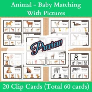🐑 20 Clip Cards (Animal to Baby Picture) – Each card displays an animal with three baby animal pictures. Kids match the correct baby to its parent.