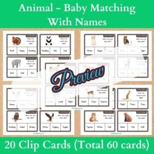 🐎 20 Clip Cards (Animal to Baby Name) – Each card features an animal and three baby name options. Kids match the animal to the correct baby name.