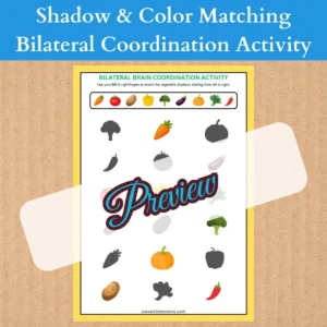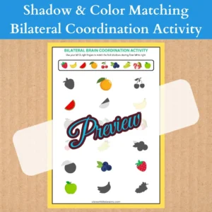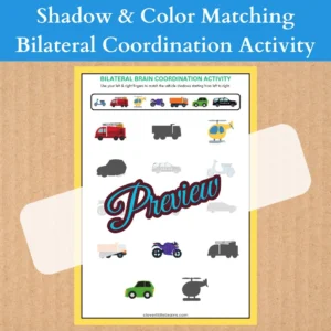 This engaging bilateral coordination exercise helps kids develop hand-eye coordination, focus, and pattern recognition while matching fruits, vegetables, and vehicles with their corresponding shadows or colors using both hands simultaneously.