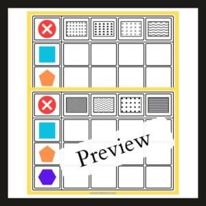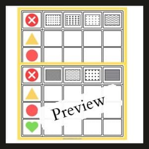 Each sheet contains three colored shapes on the left side and four different patterns on the top side. The child is provided with a set of cut-out cards, each featuring a colored shape and an associated pattern.