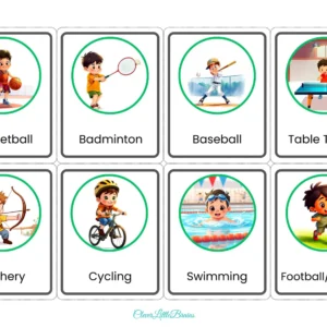 ✔ 24 Sports Flashcards – Covers a variety of sports, from team games to individual activities.